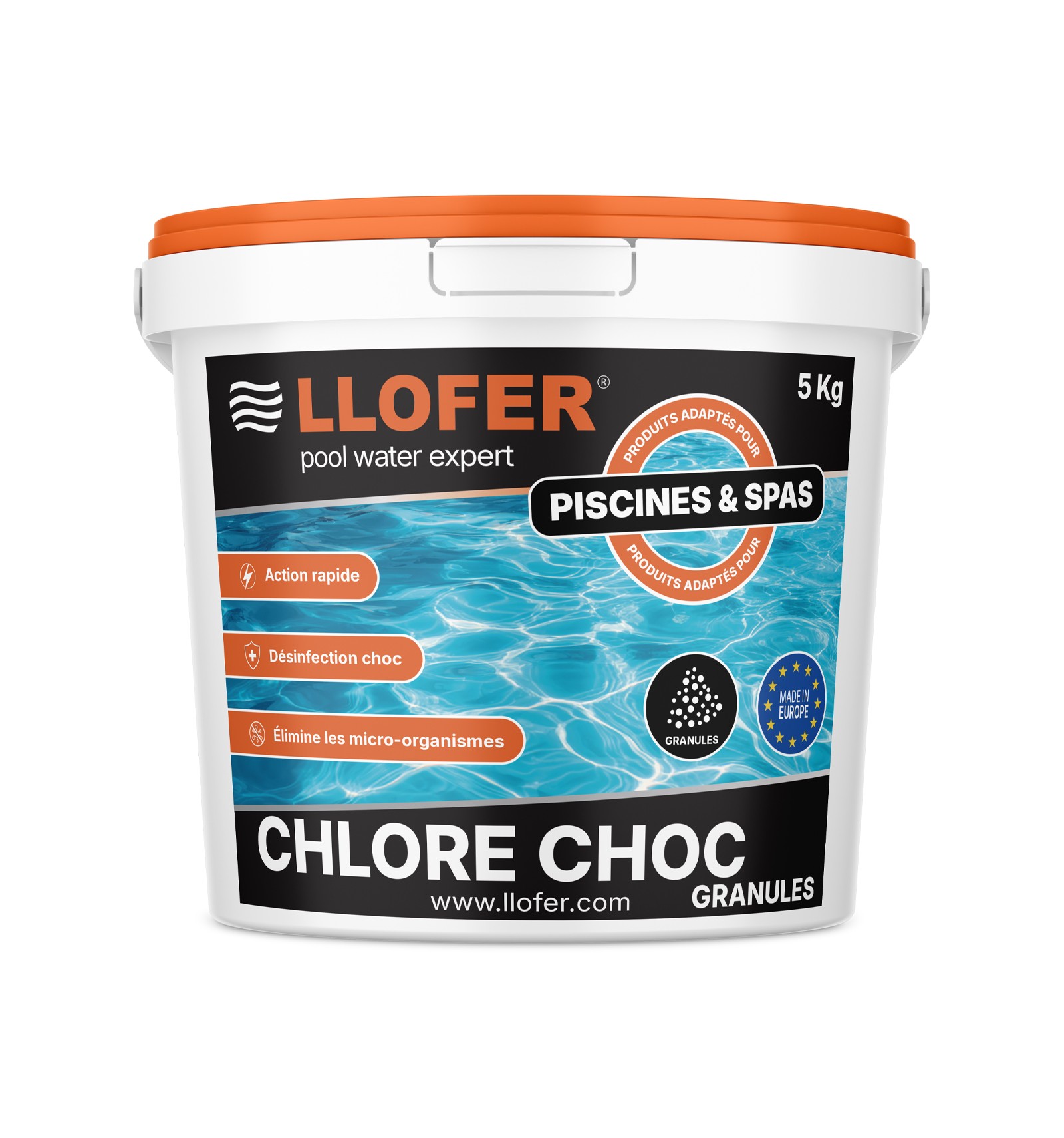 Produit organique solide à dissolution rapide, hautement stabilisé et avec une teneur de 55% en choc utile, pour la desinfection et l'entretien de l'eau des piscines.