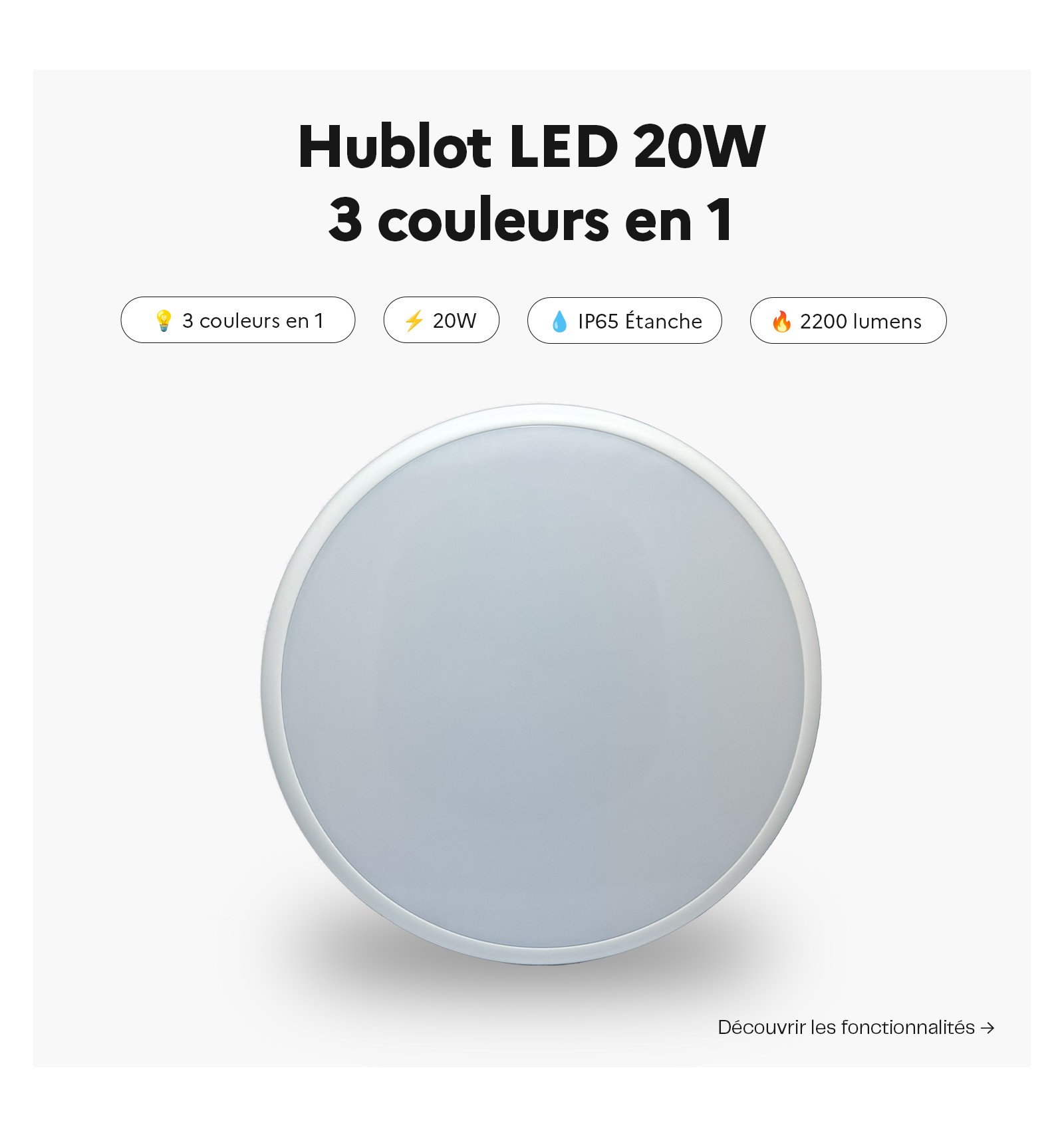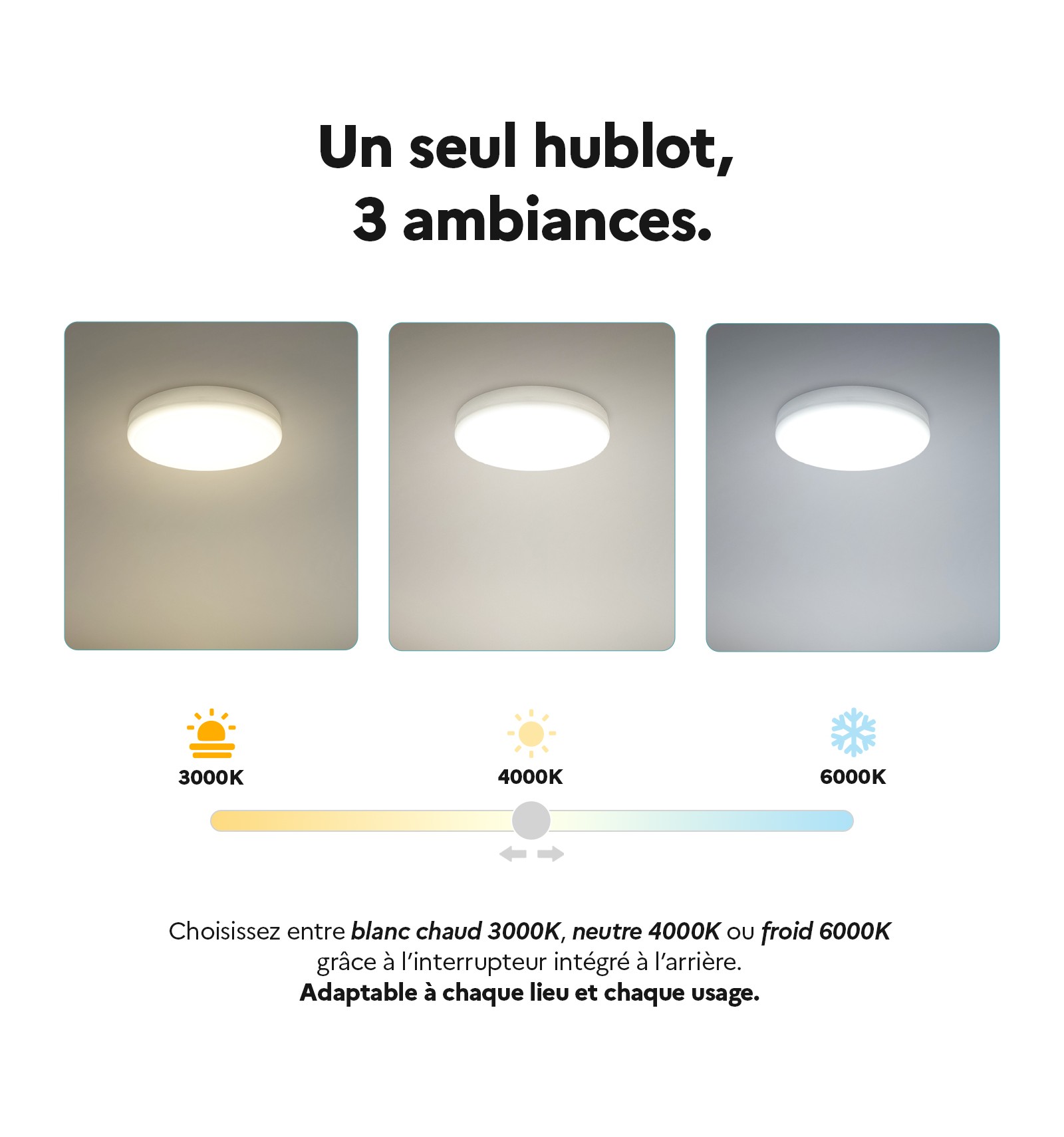 Le Hublot LED 20W EUROPALAMP™ simplifie vos installations grâce à son système 3CCT intégré. En un clic, choisissez entre 3000K (blanc chaud), 4000K (neutre) ou 6000K (froid) selon l’ambiance et l’usage de la pièce.