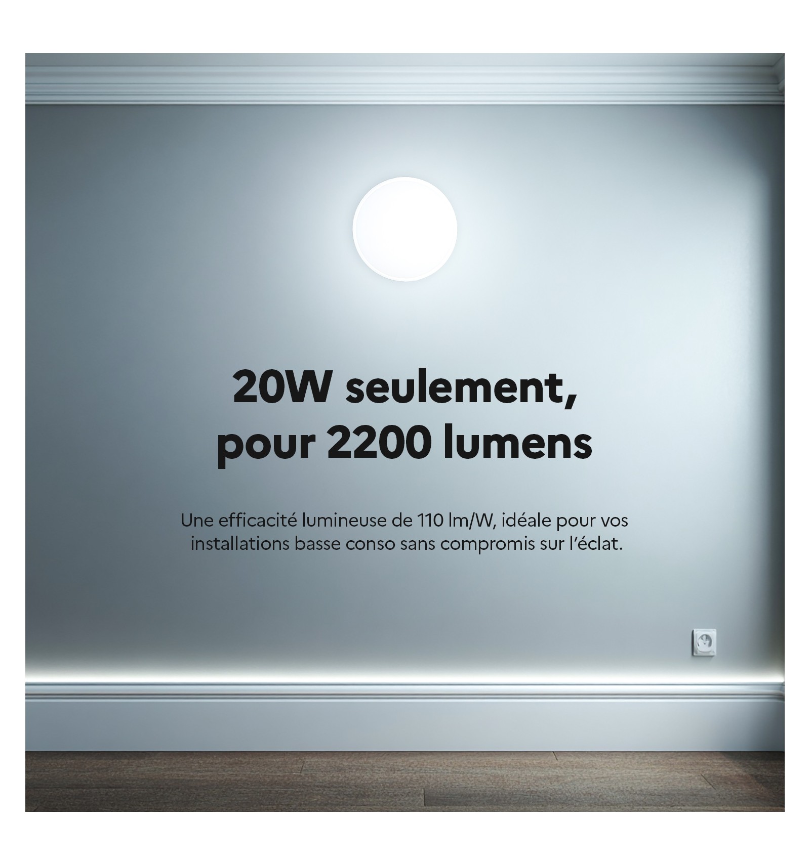 Avec seulement 20W de puissance pour 2200 lumens, ce hublot offre une efficacité lumineuse de 110 lm/W. Idéal pour vos installations basse consommation sans compromis sur la clarté.