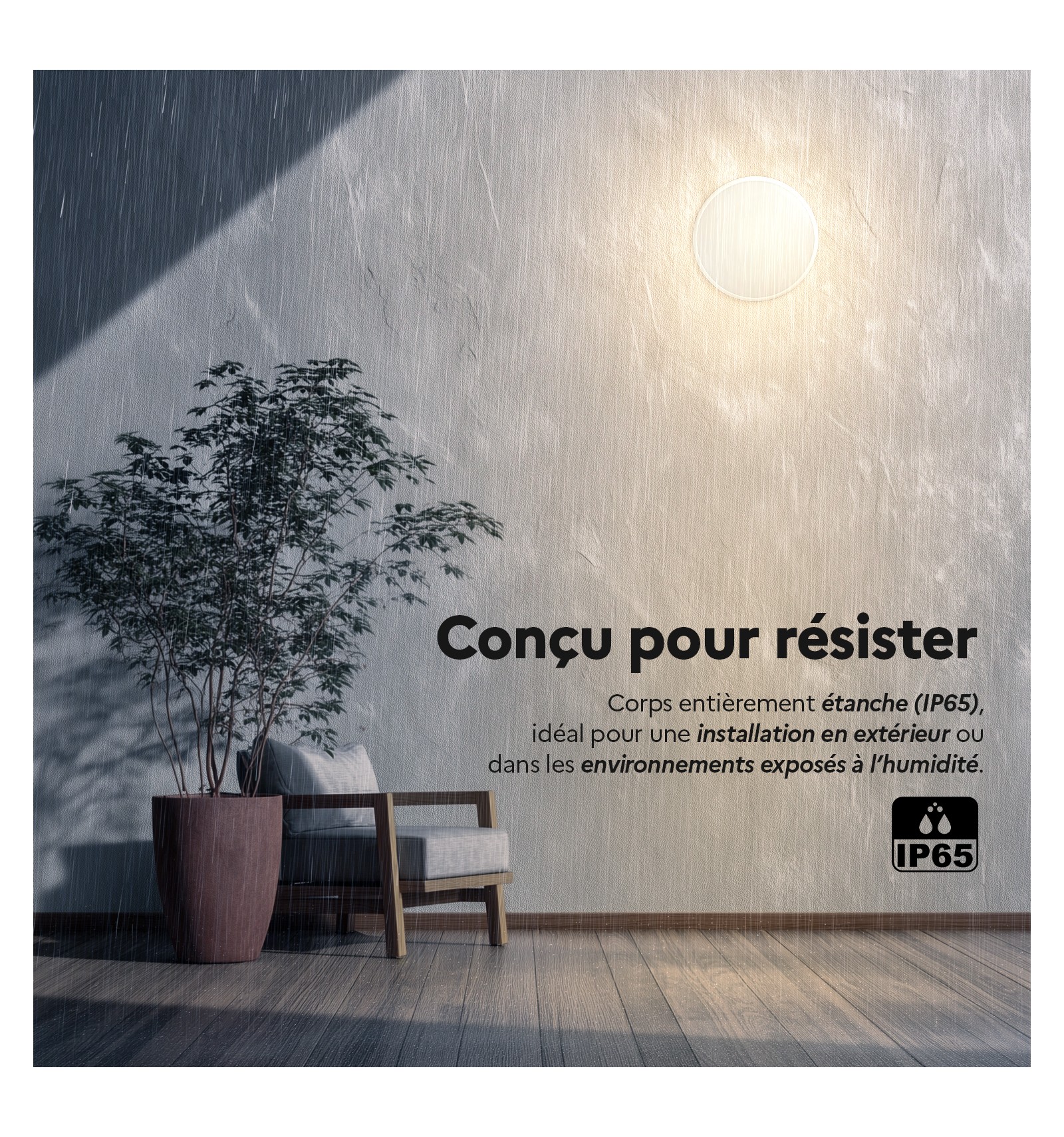 Son boîtier robuste et totalement étanche protège l’éclairage de la pluie, de la poussière et de l’humidité. Parfait pour les environnements exposés comme les terrasses couvertes, les halls d’entrée ou les pièces d’eau.