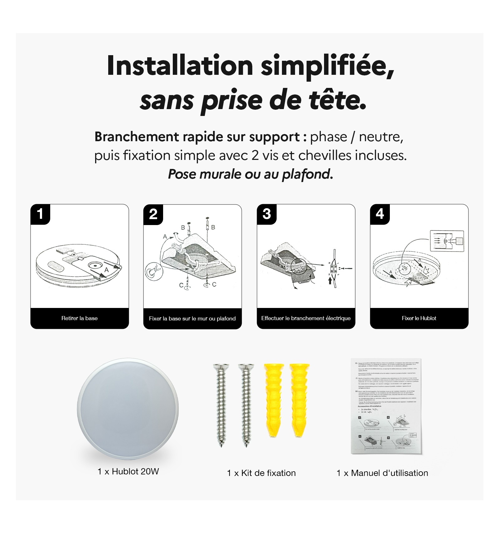 Le hublot est livré prêt à poser, avec son kit de fixation et son manuel d’utilisation en français.