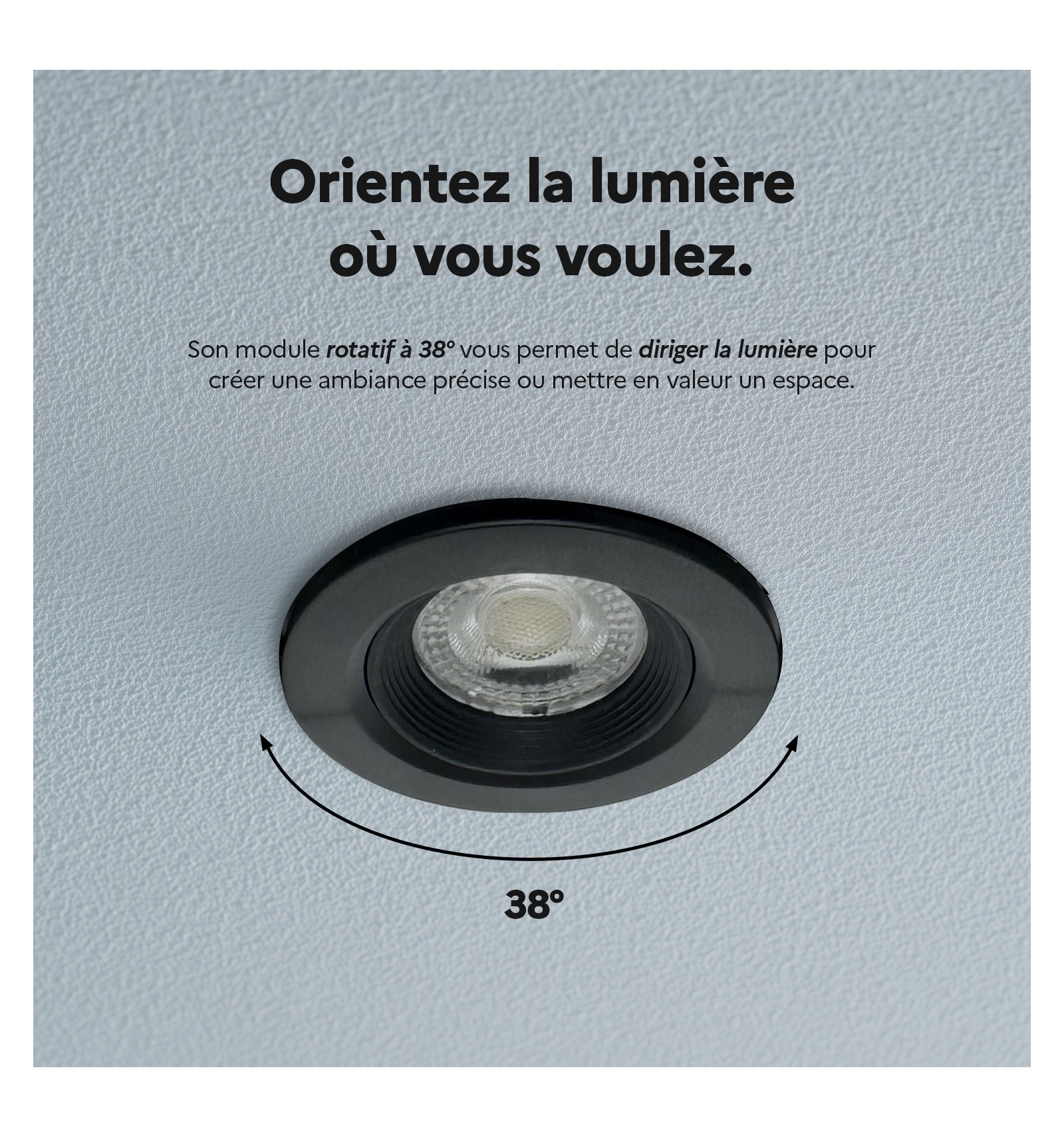 Grâce à son module rotatif à 38°, le spot dirige la lumière où vous le souhaitez. Parfait pour créer un accent décoratif ou mettre en valeur un objet ou une texture.