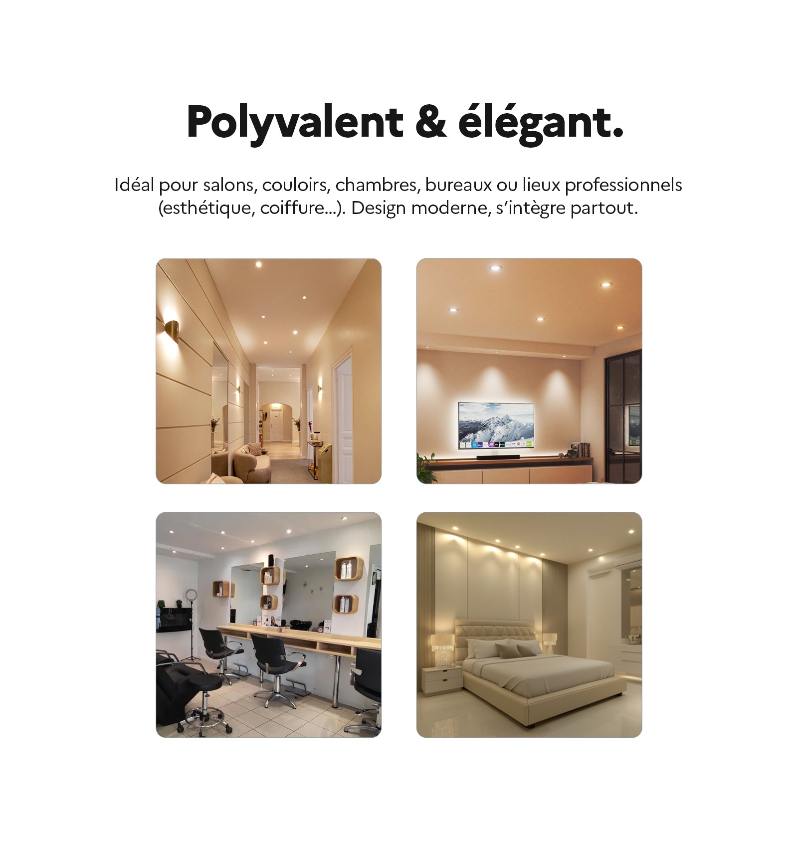 Avec son design noir mat discret et sa forme moderne, il s’intègre dans tous les environnements : maisons, bureaux, commerces, hôtels ou espaces esthétiques.