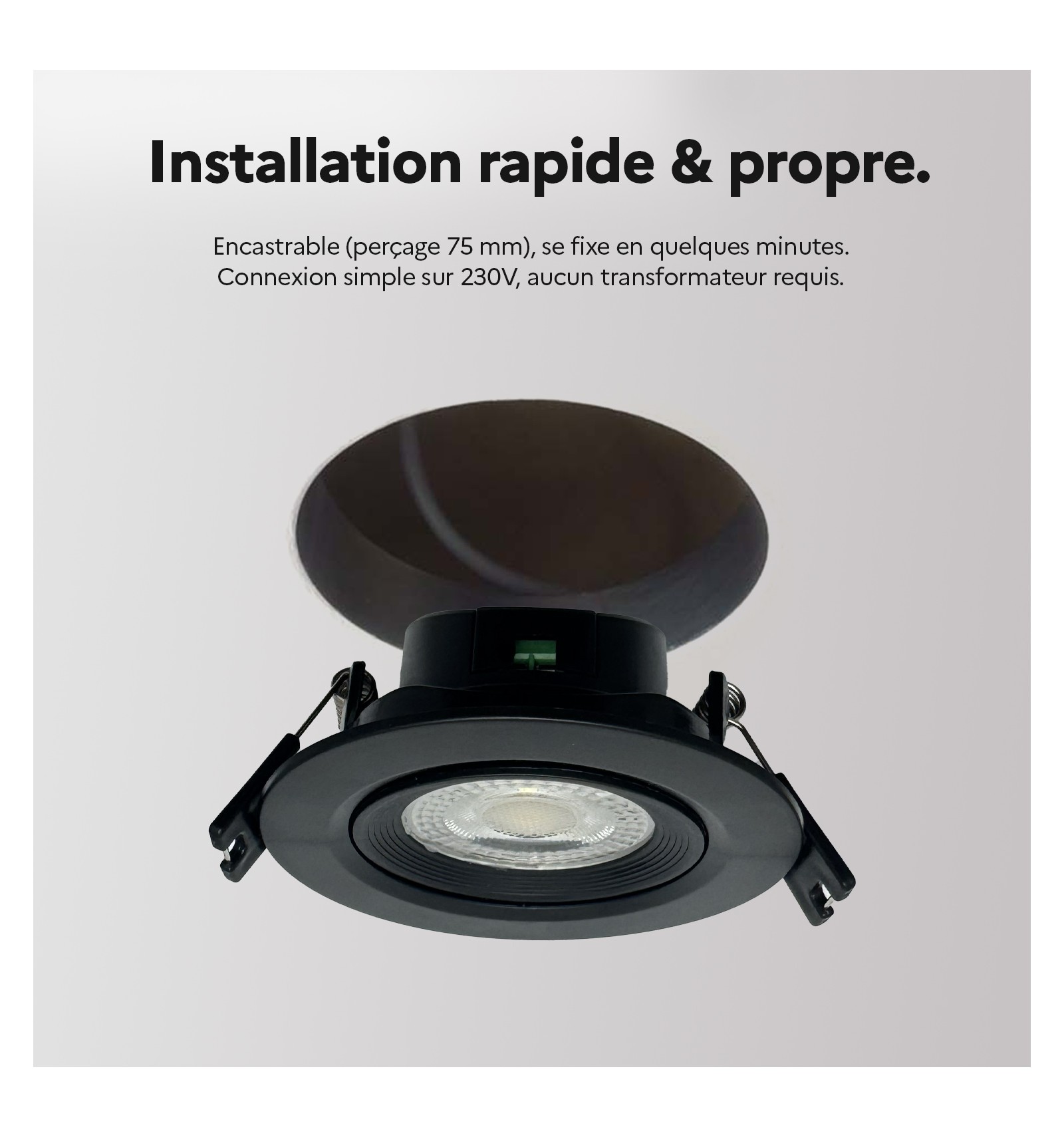 Le pot LED Encastrable 5W – 3 CCT (3000K / 4000K / 6000K) – Orientable, Dimmable réunit puissance, flexibilité et design dans un format compact. Grâce à sa technologie 3CCT, orientez la lumière, ajustez sa couleur et gérez son intensité selon vos envies — le tout avec une installation rapide et sans transformateur.