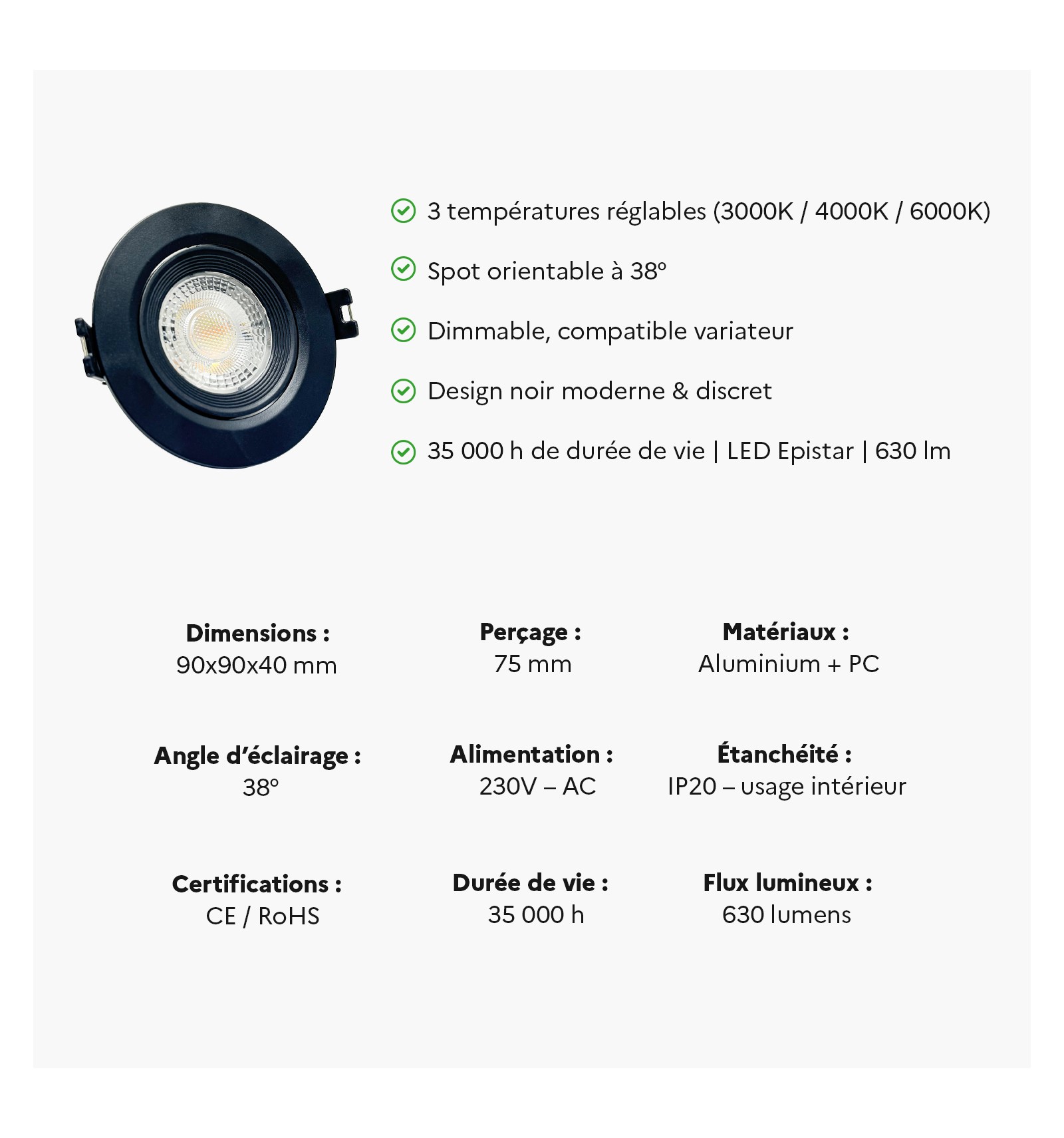 6000K – Blanc Froid : luminosité vive, parfaite pour les cuisines ou lieux de travail.