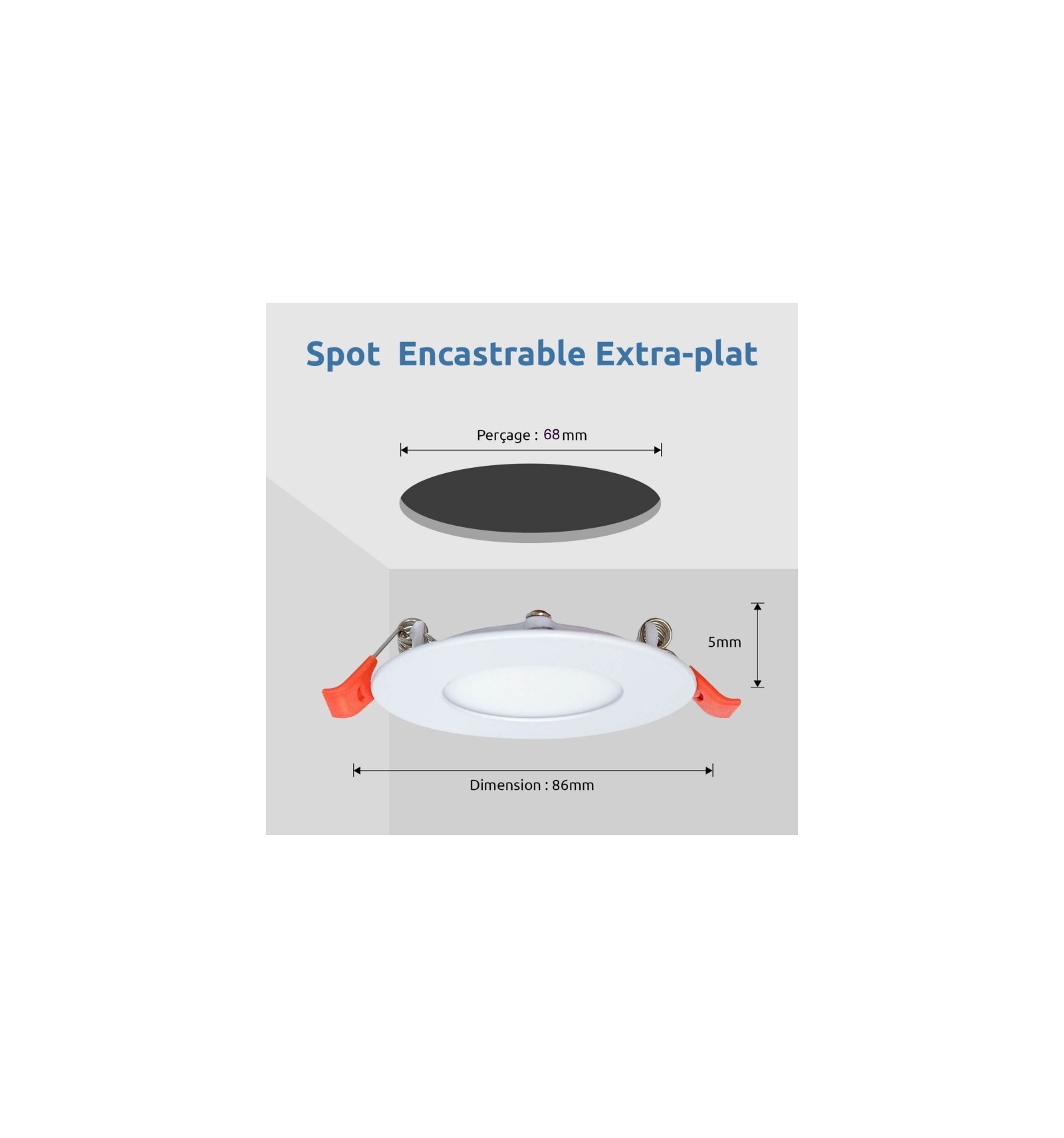 Lot de 5 Spots encastrable extra plat led blanc chaud 2700k-3000k design slim ultra fin , plafonnier Led de forme ronde adaptée pour bureau, commerce, cabinet, magasin,habitation ect...Basse consommation d'énergie. Les produits LED consomment une puissance qui est environ 10 fois moindre que celle consommée par les spots ordinaires. Longue vie, produit écologique. Garantie 2 ans